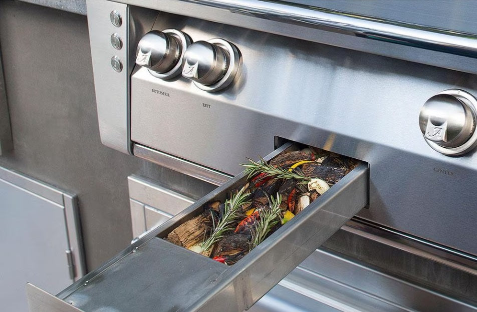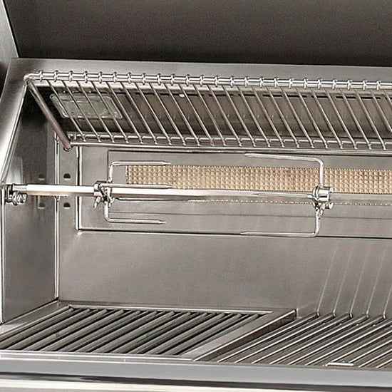 - Integrated, hidden rotisserie system with chain driven spit that will support up to 120lbs of meat