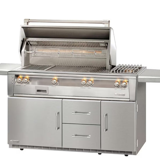 Alfresco ALXE 56 Inch Freestanding Propane Gas Grill On Refrigerated Cart With Sear Zone, Rotisserie, And Side Burner