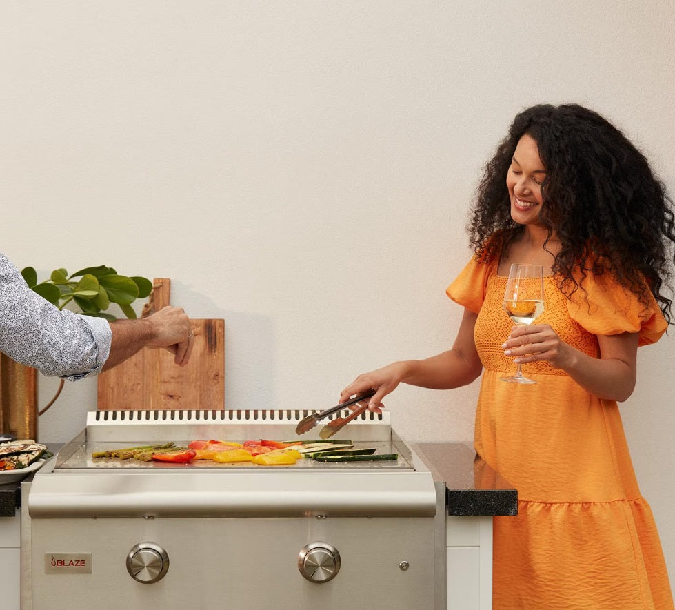 Expand your outdoor cooking into new realms with the Blaze Premium LTE built-in gas griddle, featuring signature SRL LED control knob illumination exclusive to Blaze Premium LTE Series grills. The amazing versatility of the Blaze 1/2 Inch thick griddle allows you to cook up bacon and eggs, juicy hamburgers or sizzling fajitas with rice and veggies for the whole family. This Blaze built-in natural gas griddle is equipped with two commercial quality, 304 stainless steel U-shaped burners that each deliver 18,000 BTUs of cooking power for a total of 36,000 BTUs across the 495 square inch stainless steel cooking surface. Push and turn flame-thrower primary ignition, backup flash tube secondary ignition and cross tubes ensure a steady, reliable flame with every start. A large capacity grease tray with a hole in the center directs grease down to the drip tray below for easy cleaning. This gas griddle is constructed entirely with 304 grade stainless steel and includes a stainless steel lid to cover the griddle plate when not in use.