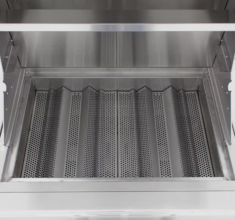 - Continuously welded stainless steel grill box with seamless, polished edges for durability