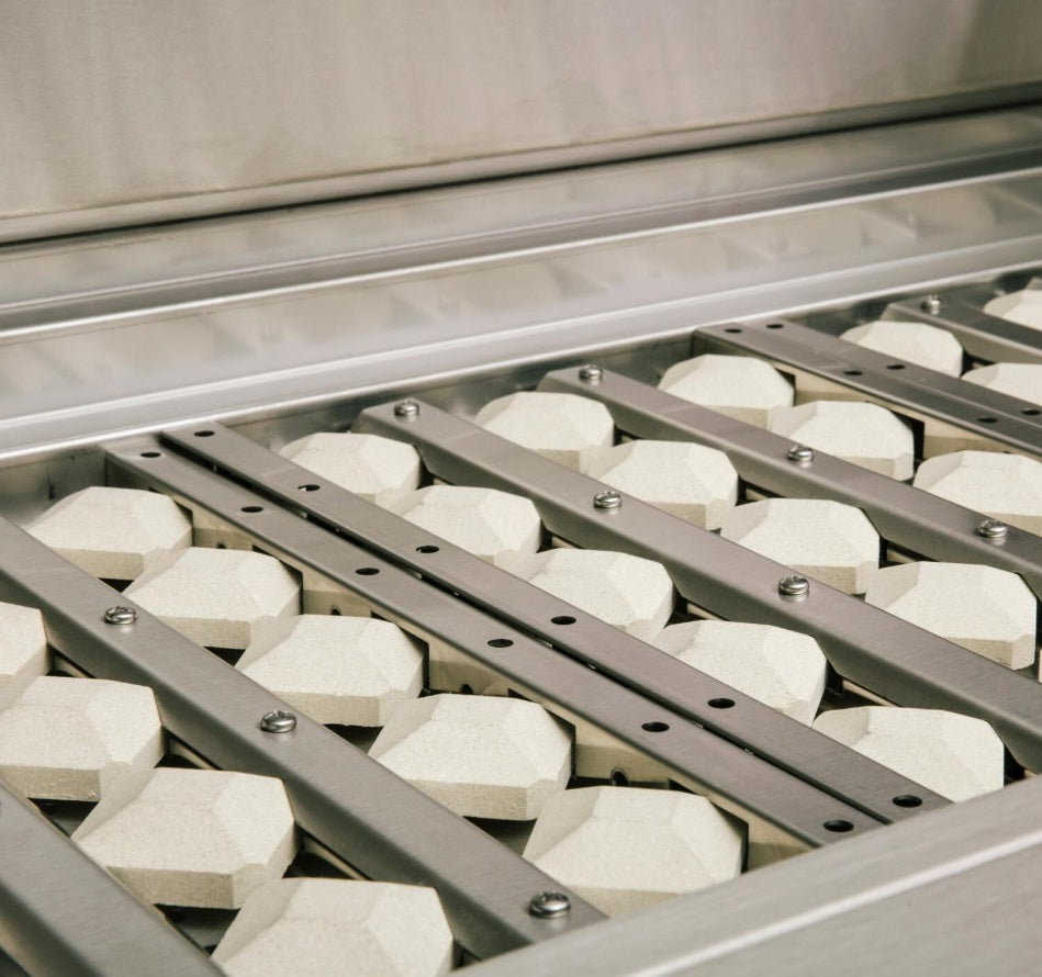 - Ceramic briquette trays distribute heat evenly across grilling surface