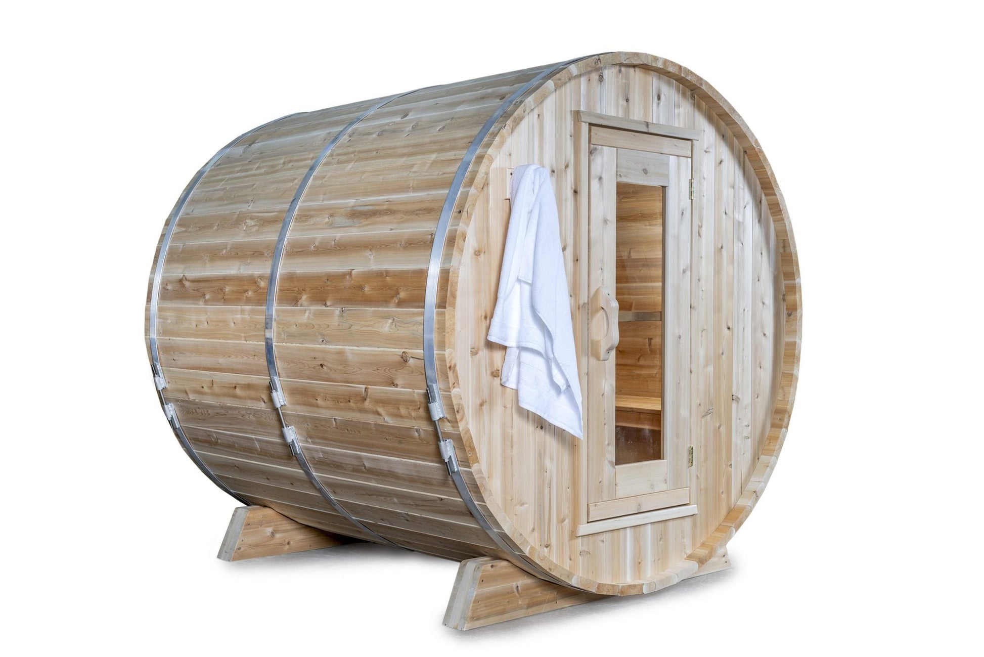 This Canadian Timber Collection Sauna by Dundalk Leisure Craft is handcrafted from Eastern White Cedar that is lighter in color and has tight knots in the wood. The door is 5mm bronze tempered glass with wooden frame and pre-hung on the front wall for easy installation. This Sauna kit comes with solid cedar cradles, aluminum bands with stainless steel hardware and is packaged in a ready to assemble kit. The round concept of the barrel sauna makes it unique and very efficient to heat as well as encourages proper air flow during sauna use.