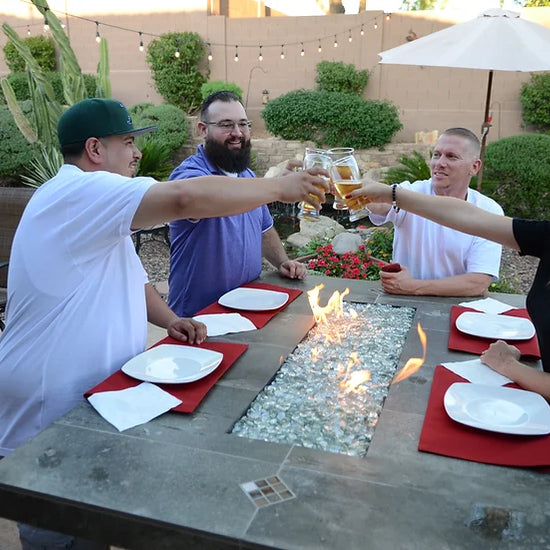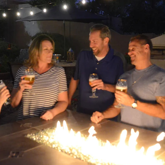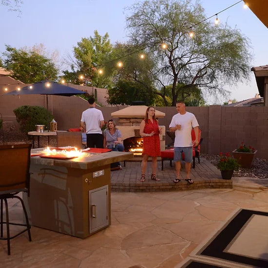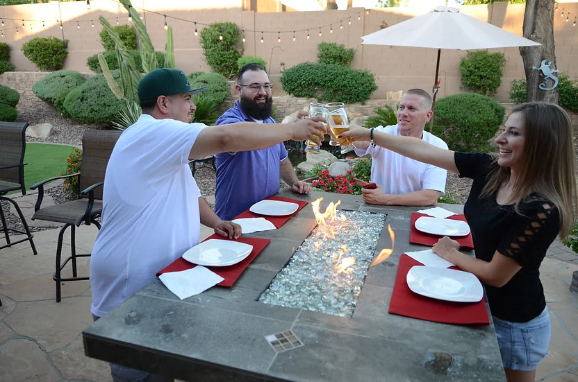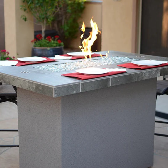 Entertainer Bar Table With Firepit. This Outdoor Kitchen Fire-table will accommodate up to 6 people around this Propane or Natural Gas Fire Table. This model can be ran off of a Propane bottle or hooked up directly to Natural Gas. Built using metal studs, concrete board, and porcelain tile and synthetic stucco. This Firepit has a regulated flame that is controlled with a hearth turn key ball valve. This model will arrive fully assembled just plug and play your gas lines. Fireglass is used to cover the burner and create a cool look with style.