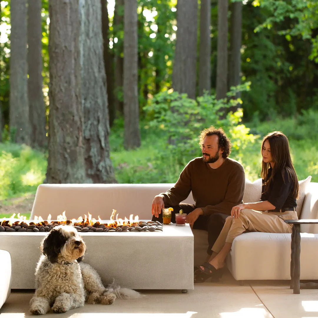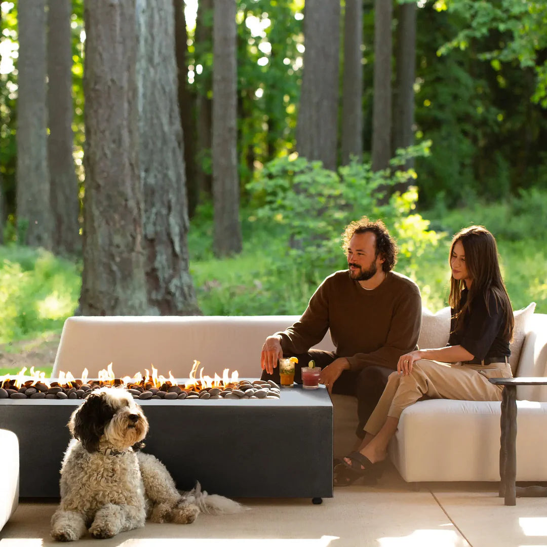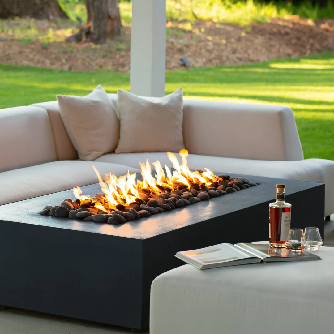 The spacious rectangular design gives everyone room to gather comfortably, making it perfect for anchoring larger seating arrangements. The fire pit’s carefully designed height allows it to double as a functional coffee table, creating a natural center point for food, drinks, and conversation.